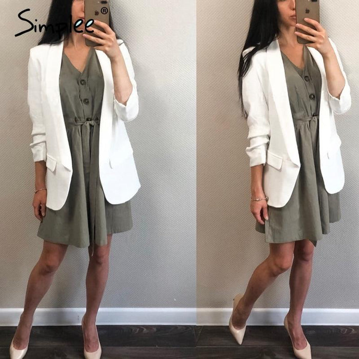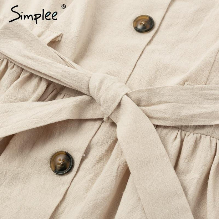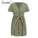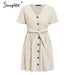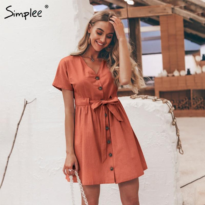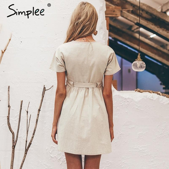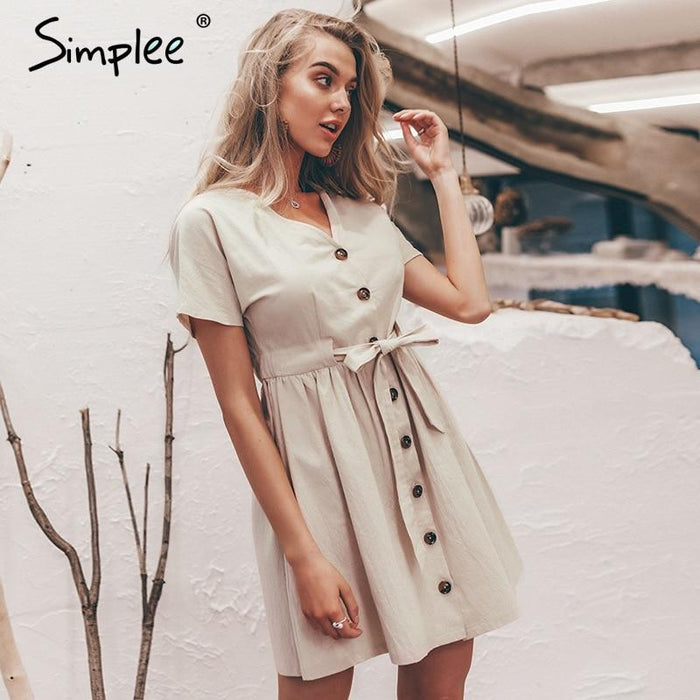 Material : CottonDecoration : ButtonWaist : EmpireSilhouette : Line ASleeve Length (cm) : ShortPattern Type : SolidSleeve Style : RegularSeason : SummerStyle : Urban clothingGender : WomenNeckline : V- neckDress Length : Mini, above the knee