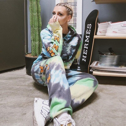 Darlingaga Streetwear Butterfly Print Tie Dye Tracksuit Women 2 Piece Set Fashion Hoodie and Sweatpants Matching Sets Sportswear