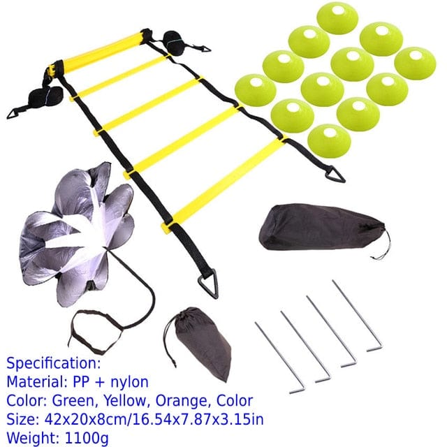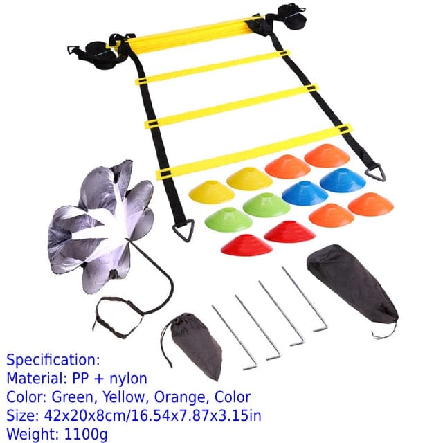 1 X Agility Ladder 1 X Resistance Parachute 12 X Disc Cones 4 X Steel Stakes 2 X Drawstring Bags