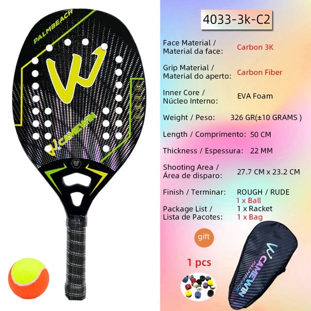 CAMEWIN High Quality 3K Carbon and Glass Fiber Beach Tennis Racket Soft Rough Surface Tennis Racquet with Bag and Ball