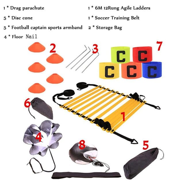 *1. Our speed and agility training equipment includes an agile ladder, a resistance running parachute and a bag, five sports cones, four piles, a football training belt, five football captain sports armbands and a portable bag.