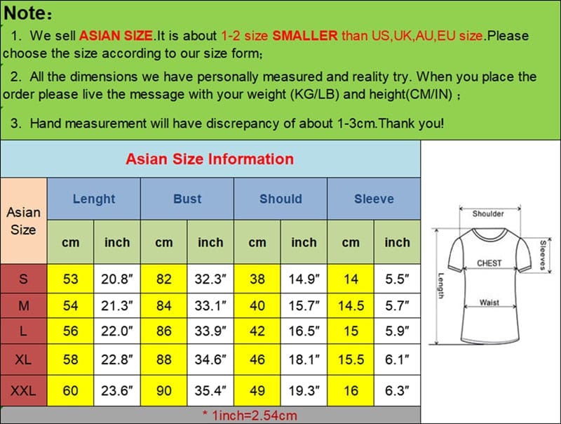 Our T-shirts are Asian Size , it is about 1-2 sizes smaller than US, EU, UK, AU Size,please check the size chart before order.