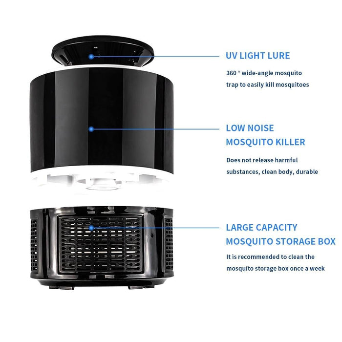 Material: Plastic, MetalColor: White, BlackPackage Size: 12.2 x 12.2 x 17.5 cmProduct Type: LED Smart Touch Mosquito KillerDesign: Smart TouchFunction: Anti-mosquitoApplicable Area: 51-100 Square MetersWeight: 310gVoltage: 110-220VPower: 5WInput: DC5V-1ASize:19X12cmX12cmQuantity: 1PcsOccasions: Kitchen, Living Room, Office, Dining Room, Bedroom, Outdoor Garden Patio BackyardPackage contents:1X LED LAMP1X USB CableFeatures:High efficiency cyclone suction, easy to use.Energy saving and automatic lighting control.Non-toxic and environmentally friendly.Suitable for home use.Principles for using:1.,Make Sure you use this fly trap in the dark and closed place(close the lights, windows and doors)2.Put it 0.5~1.0 meters above the ground3.Continuously Running it for 2-3 days without touch it and without people around.(when firstly use)4.Continuously running it for more then one week to kill almost all mosquitoes