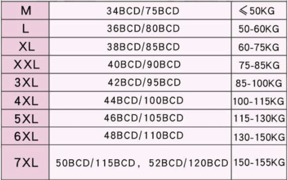 M / suitable for 40-50 kg, usually wear 34/75 BCDL / suitable for 50-60 kg, usually wear 36/80 BCDXL / suitable for 65-75kg, usually wear 38/85 BCDXXL / suitable for 75-85kg, usually wear 40/90 BCD3XL / suitable for 85-100 kg, usually wear 42/95 BCD4XL / suitable for 100-115 kg, usually wear 44/100 BCD5XL / suitable for115-130 kg, usually wear 46/105 BCD6XL / suitable for 130-150kg, usually wear 48/110 BCD7XL / suitable for150-155 kg, usually wear 50/115,52/120BCD
