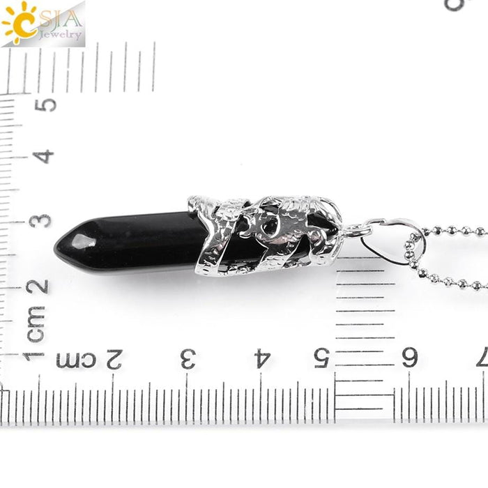 Necklace Feature: Natural Stone Prism + Dragon Wrapped Design Plated: Platinum-Plated  Pendant Size: Approx 51 x 10 x 10mm Necklace Chain length: Approx 18 inches (45CM) Natural Stone Pendant: Amethyst & Black Onyx & Blue Sand & Brown Sand & Green Aventurine & Lapis Lazuli  & Rose Quartz & Tiger Eye & White Crystal Synthetic Stones: Blue Turquoise & Malachite & Opal Necklace Packaging: Opp Bag + Bubble Wrap