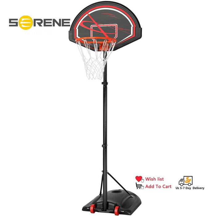 Turn your backyard into a playground filled with laughter and memories with the SmileMart portable basketball system. It has a big weighted base that can be filled with water or sand for added stability and safety, and the two wheels ensure good mobility of the stand. Featuring 6 pairs of holes for height adjustments, the telescoping post can be easily adjusted from 217 cm/7' to 277 cm/9' in 12 cm/4.7" increments. It is constructed of high-impact polyethylene plastic backboard and base, and a powder-coated metal stand, our water, and weather-resistant basketball hoop are designed to withstand the elements. The base is equipped with two 4"/10 cm big wheels for effortless moving even when the base is weighted by stuffing.