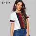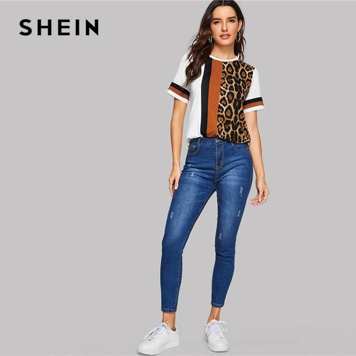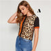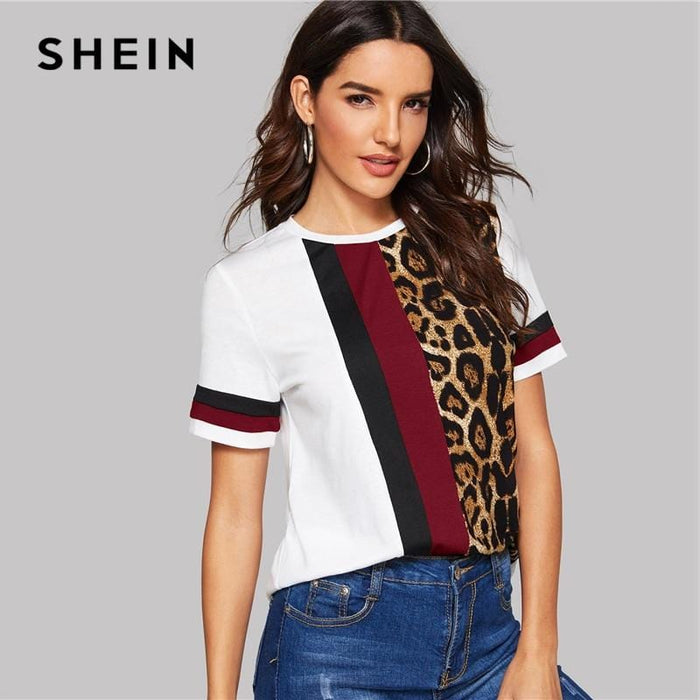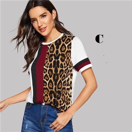 Material : PolyesterMaterial : SpandexItem Type : CapsFabric Type : ClothStyle : CasualTops Type : ShirtsPattern Type : Striped, LeopardSleeve Length (cm) : ShortSleeve Style : RegularGender : WomenCollar : Round NeckClothing Length : RegularFabric : Fabric has some stretchComposition : 95% Polyester, 5% SpandexOccasion : Casual WeekendPlacket Type : PulloversSeason : SummerLength : RegularDecoration : Colorblock