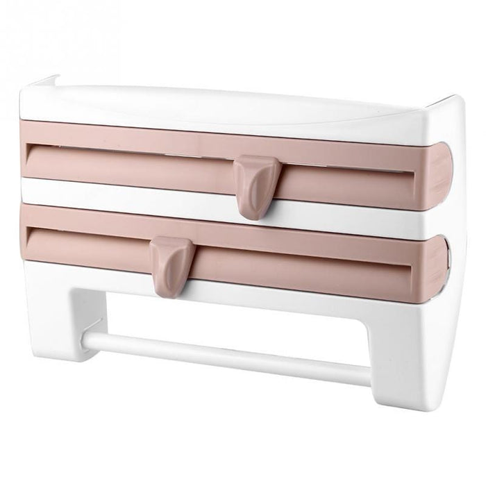 Keep your kitchen essentials organized and in one place. This wall mount paper towel holder with spice rack makes your kitchen efficient and convenient in unimaginable ways. The holder has two dispensers for your foil, plastic wrap, or wax paper!Each dispenser has a sliding cutter to dispense and trim your paper quickly and easily. The top of the holder is flat, so you can keep frequently-used spices close at hand. with blades and smooth handle to ensure clean cut for quick dispensing and food prep/storage. Ergonomic design, convenient for use.Features:Built in dispensers for plastic wrap and aluminum foil with space on top for spices.Easy one hand operation provides easy access to your kitchen necessities.The bottom of the bracket bar can be disassembled, suitable for 28cm length of the paper towel.Two kinds of cutter button; round cutter for tin paper or oil-absorbing paper, triangular cutter for plastic wrap.Removable paper towel support holder rod, very practical.Specifications:Condition: 100% Brand NewMaterial: ABSColor: White, Gray Blue, Khaki (Optional)Size: Approx. 39 x 10 x 24cm / 15.35 x 3.94 x 9.45inchPackage Weight: Approx. 792g